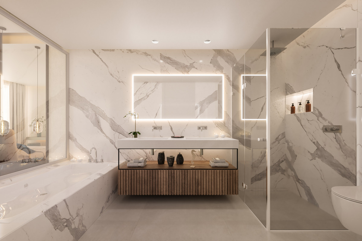 Setting: Close To Shops Orientation: East, South, South West Condition: New Construction Pool: Communal, Heated Climate Control: Hot A/C, Cold A/C, U/F Heating Views: Sea, Mountain, Panoramic, Garden Features: Lift, Fitted Wardrobes, Private Terrace, Solarium, Storage Room, Domotics Kitchen: Kitchen-Lounge Garden: Communal, Landscaped Security: Gated Complex, Alarm System, 24 Hour Security Parking: Underground, Garage, Private Category: New Development