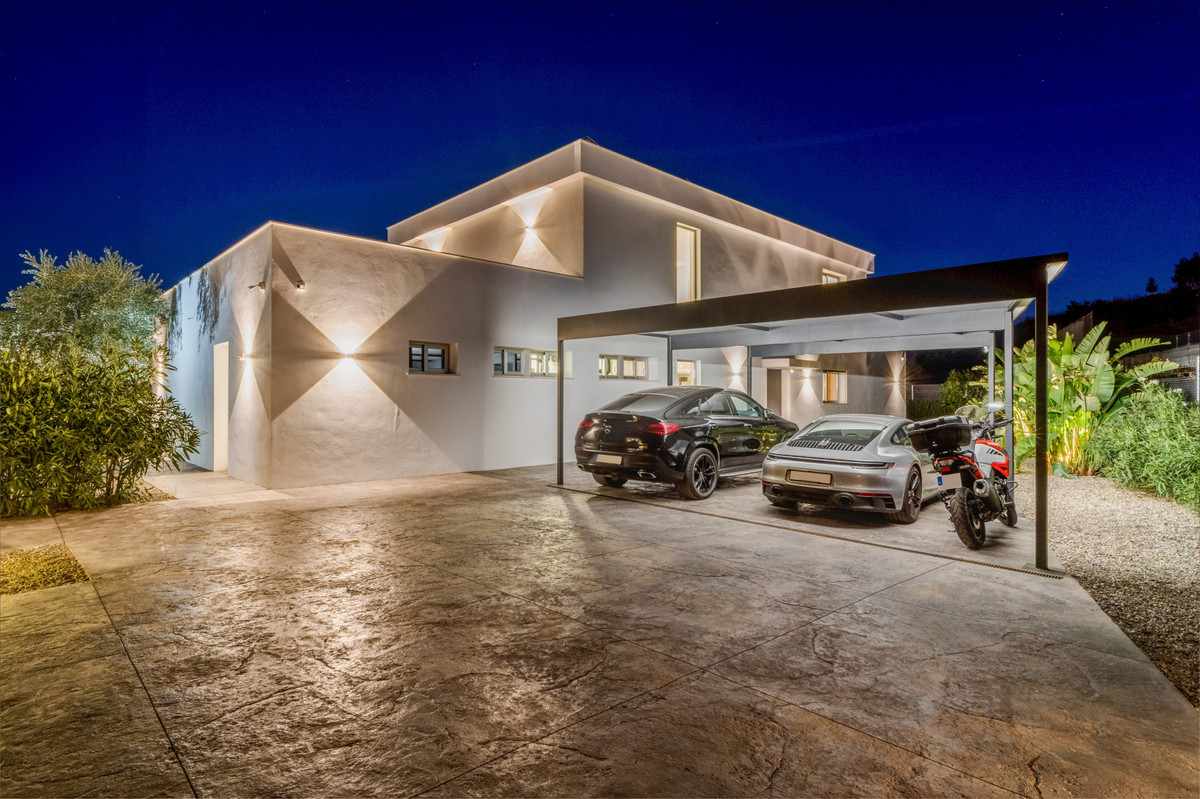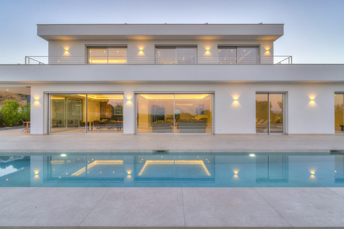 This exceptional contemporary villa, exclusively available through sole agency, is situated in the sought-after mountainside enclave of Sierra Gorda, Coin, Malaga. Boasting panoramic views of both the surrounding mountains and countryside and stands on a generous 1,800m² plot, showcasing the best of Costa del Sol living with its celebrated climate and proximity to all amenities. The residence features four bedrooms one of which is used as an office but can be easily transform into a bedroom. It has three en suite bathroom as well as a guest toilet accommodating modern lifestyles with ease. The open-plan living and dining area is bright and airy, enhanced by floor-to-ceiling window doors that seamlessly connect the interior to the private terraces, flooding the space with natural light. The kitchen, fitted with Siemens appliances and presented in pristine condition, adds a touch of luxury and efficiency, making the property ideal for gastronomy enthusiasts. For outdoor living, the property excels with its expansive terraces perfect for al fresco dining, a private pool with views across the lush garden and dramatic mountains beyond, and an outdoor shower for added convenience. Smart home systems, including surveillance cameras, video entrance and remote-controlled gate, provide security. The villa is also equipped with underfloor heating throughout, air conditioning units, solar panels, automatic irrigation, and fibre optic internet, combining comfort and ecological sensitivity. Further highlights include a private carport for two vehicles, laundry room, double-glazing, electric blinds, security shutters, and an armored door. The master suite offers a tranquil oasis, generously proportioned, has it's walk-in wardrobe and and elegant bathroom with stand in shower. Imagine sinking into a warm, soothing bath as natural light pours in through expansive picture windows. From the comfort of your elegant soaking tub, you’re treated to sweeping views of mountains. As the world unfolds outside, you're wrapped in serene stillness — a perfect blend of privacy and connection with nature. Located merely five minutes drive from supermarkets and shopping centres, and just 30 minutes to Marbella City, this contemporary villa offers an unparalleled combination of luxury, convenience living on the Costa del Sol.