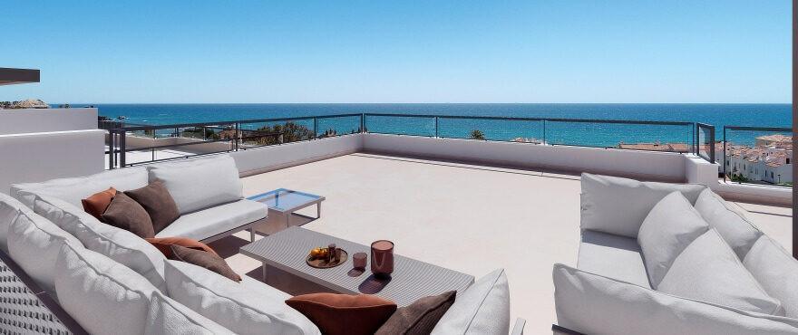 2 bed, 2 bath apartments from 385.000 euros with 83 m2 built plus 28 m2 terrace 3 bed, 3 bath penthouses from 535.000 euros with 111 m2 built plus 109 m2 terrace Prices exclude 10% VAT and include one garage space. Ready for occupation second quarter 2026. This boutique complex consits of 58 appartements with 2 or 3 bedrooms with fantastic sea views, walking distance all amenties and the beach!
