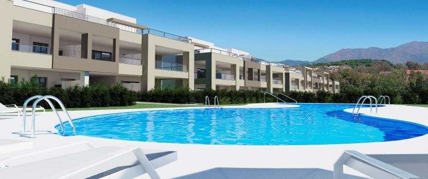 Setting: Close To Shops Pool: Communal Climate Control: Hot A/C Views: Sea, Beach, Panoramic, Pool Features: Ensuite Bathroom Kitchen: Fully Fitted Garden: Communal Parking: Communal Category: New Development