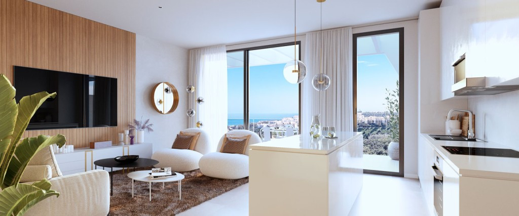 Setting: Close To Golf Condition: Excellent Pool: Communal Climate Control: Hot A/C Views: Sea, Mountain, Golf, Pool Features: Fitted Wardrobes, Ensuite Bathroom Kitchen: Fully Fitted Garden: Communal Category: New Development