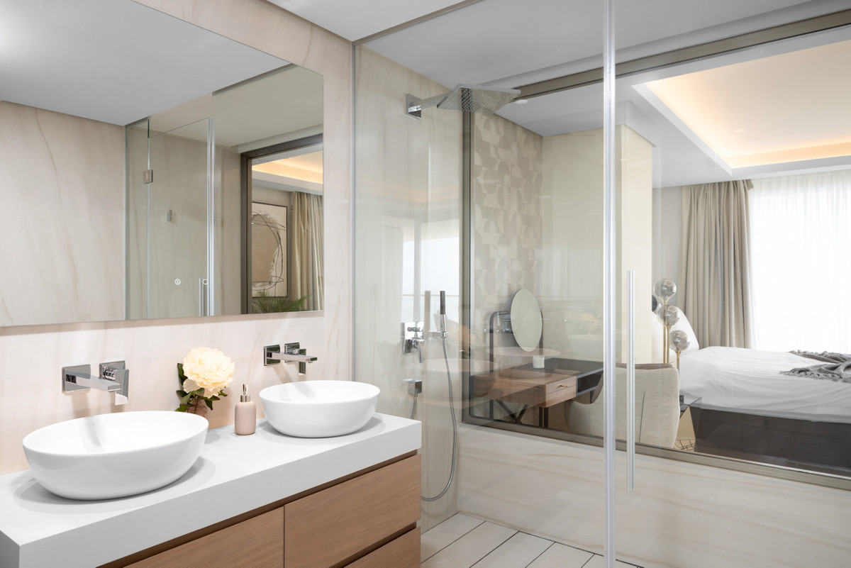 Setting: Beachfront, Beachside, Close To Sea Orientation: South Condition: Excellent, New Construction Pool: Communal, Indoor Climate Control: Air Conditioning, U/F Heating Views: Sea Features: Covered Terrace, Lift, Near Transport, WiFi, Gym, Sauna, Ensuite Bathroom Furniture: Fully Furnished Security: Gated Complex, Alarm System, 24 Hour Security Parking: More Than One, Private Category: Beachfront, Luxury