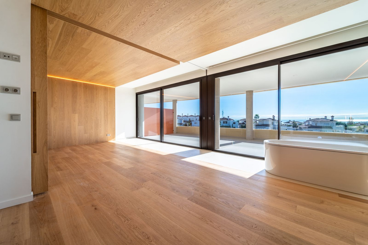 Brand new luxury south east facing apartment, located in the exclusive urbanization, with 2 bedrooms, 2 bathrooms, spacious living-dining room, open plan kitchen fully furnished and equipped with electricial appliances from Bosch, laundry area with washing machine/dryer, large terrace of 40m2 with beautiful sea views. Main bedroom with ensuite bathroom and walk-in closet. This apartment is distinguished by the ingenious movable wall that connects the master bedroom-suite to the living room. This elongated sliding door is designed to duplicate the entrance of natural light and enjoying much better views. This easy interaction between the living spaces creates a flexible open area that is designed for you to enjoy the climate and lifestyle of Southern Spain. This clever design not only maximises the natural light of the Costa del Sol in both rooms, but also allows you to admire the splendid views from every corner of your home. Air conditioning hot and cold, video intercom, domotic system, pre-installation alarm system, water filter system, under floor heating in both bedrooms and bathrooms. Includes two parking spaces (one with electric car charger) and one storage room.